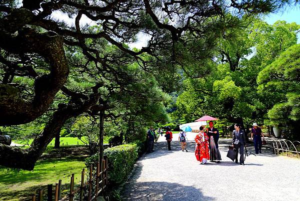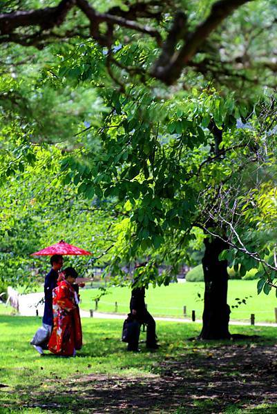還沒走多久,我的汗已經大珠小珠落玉盤了,整個身體的潮濕度和玩”冰桶挑戰”後模樣已經相去不遠,此時卻看到遠方穿著極厚重,緊密包裹著仿如包肉粽一般的一對新人,穿著日本傳統婚禮服飾在庭院裡走來,想必是拍婚紗照吧!真是太太辛苦了…..我打從心底佩服…..