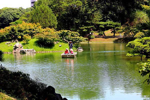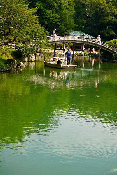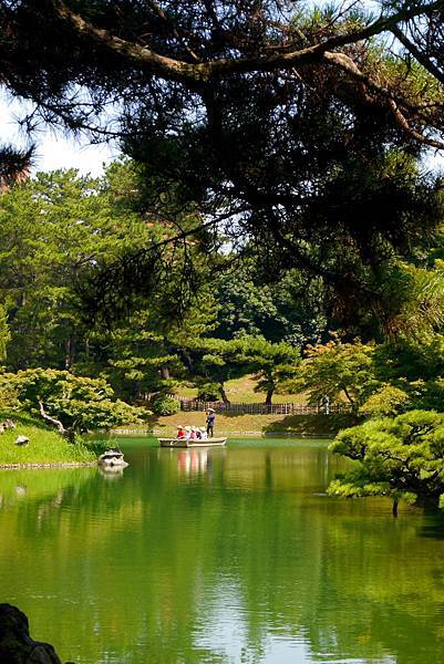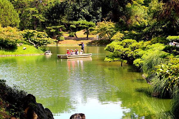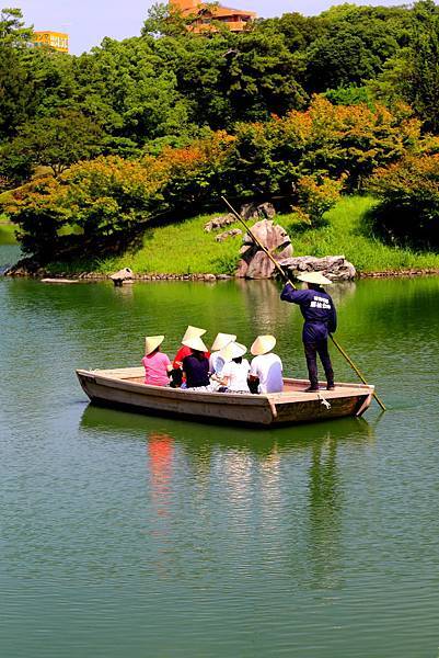 George直說有了在”飛來峰”上觀景才感受到栗林公園的價值,感嘆可惜無船行經,否則畫面會更美好,果真在我們已經離開飛來峰不遠處時,一見到有船行來,George又馬上奔回飛來峰上補景。