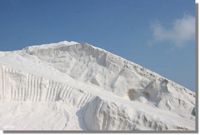 經歷了一些風沙吹襲,白色的鹽山也染上了一層層灰,破壞了幾許美感。
