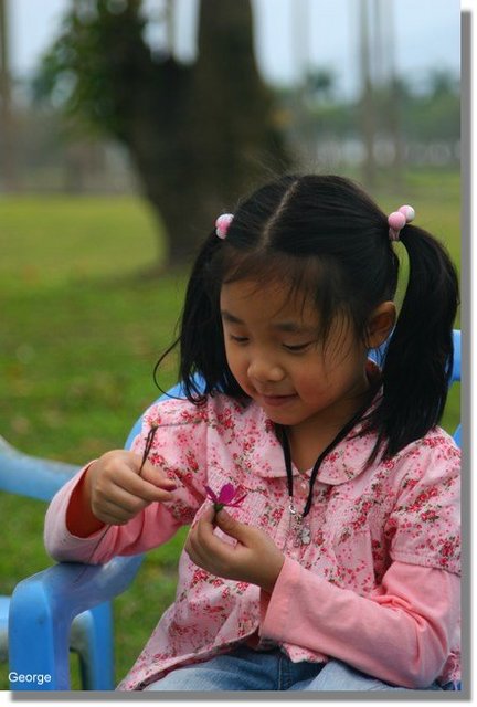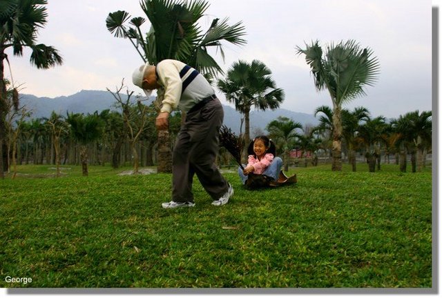 Cherry爸拉著葉柄,Jasmine坐在那枯萎的樹葉上,祖孫兩人快樂地玩著滑